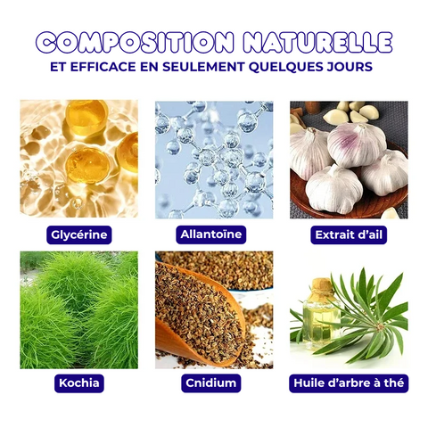 • Composition : Extrait d’ail, Huile d’arbre à thé, Allantoïne, Cnidium, Kochia et Glycérine