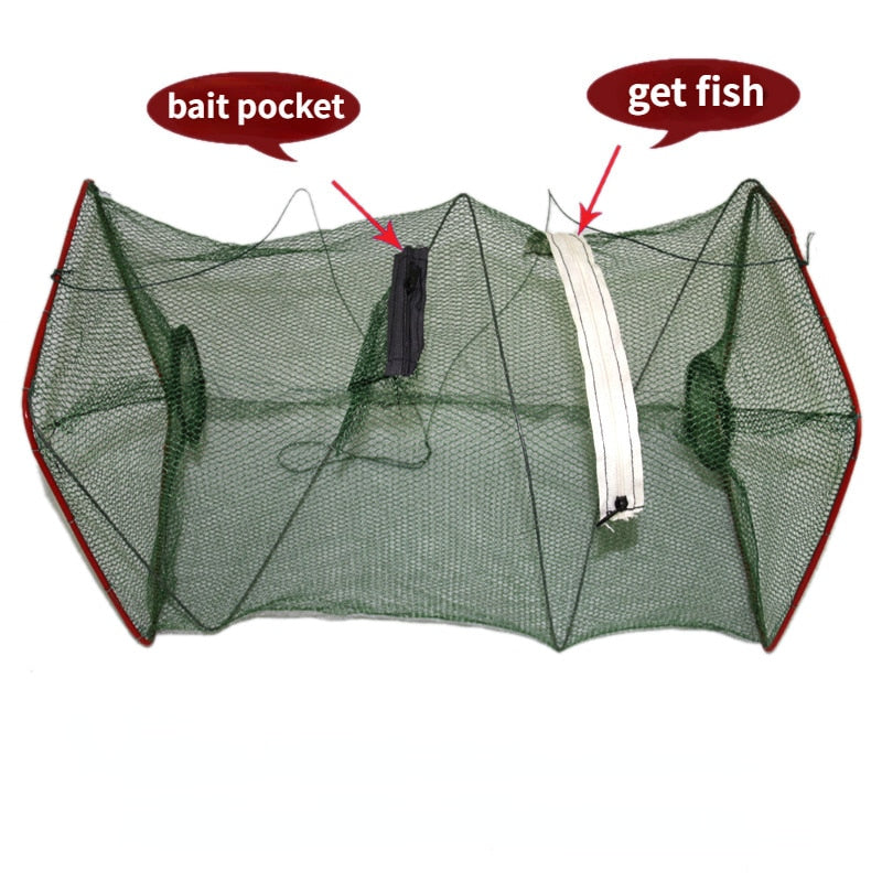 les côtés du filet sont conçus avec une entrée séparée pour attraper facilement les proies. Le bas du filet a une ouverture en filet pour placer ou retirer facilement l'appât. Vous pouvez maintenant attraper deux fois plus de poissons en un rien de temps.